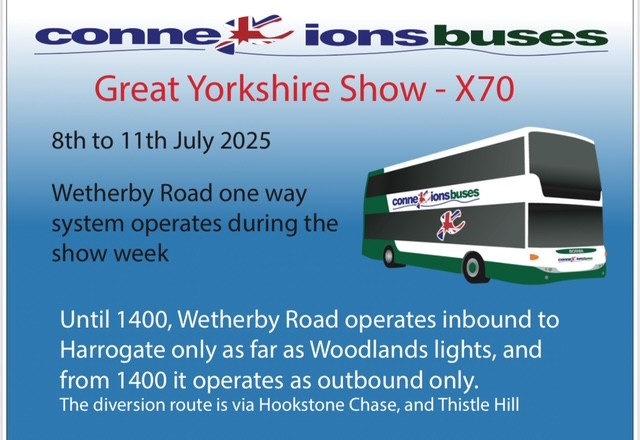 X70 inbound normal route until 1400. After that Calcutt to Woodlands corner then normal route to Harrogate